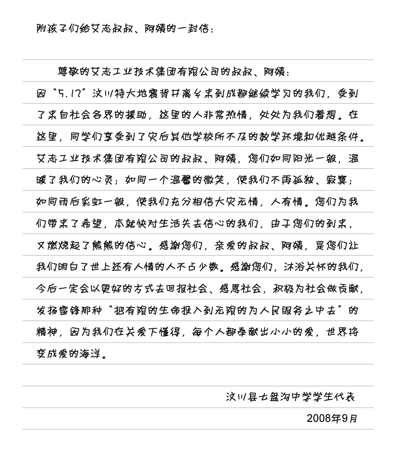 隨后,艾志工業(yè)技術(shù)集團公司又趕赴成都龍泉威州中學(xué)和四川峨眉山市水墨中學(xué)安置點,分別為19名和6名優(yōu)秀的學(xué)生發(fā)放“艾志工業(yè)助學(xué)金”。