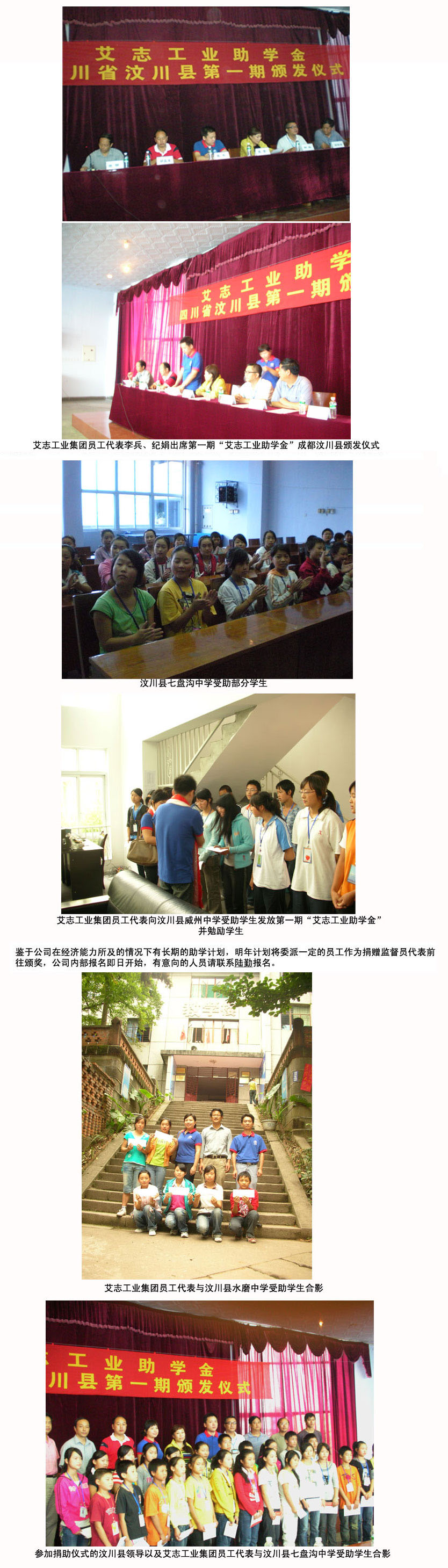 繼2008年8月29日艾志工業(yè)技術(shù)集團有限公司在甘肅秦安縣第五中學(xué)頒發(fā)了第一期“艾志工業(yè)助學(xué)金”后,艾志工業(yè)技術(shù)集團公司成都辦員工李兵、紀(jì)娟于9月12日上午九點,在成都青龍場西南石油大學(xué)汶川縣七盤溝九年一貫制中學(xué)臨時安置點參加了第一期“艾志工業(yè)助學(xué)金”四川汶川頒發(fā)儀式。當(dāng)?shù)卣托7綄?span style="font-family:Verdana">艾志工業(yè)技術(shù)集團有限公司的善心表示熱烈歡飲和衷心感謝,汶川縣人民政府副縣長王霞等有關(guān)領(lǐng)導(dǎo)出席了“艾志工業(yè)助學(xué)金”的頒發(fā)儀式并發(fā)表講話。